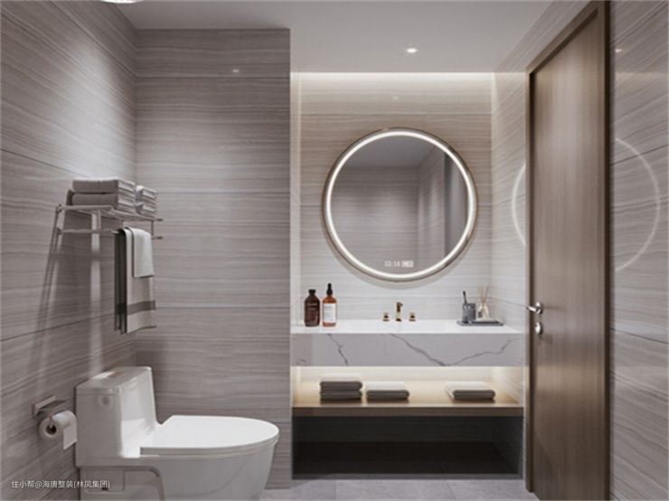 本方案的卫生间沿用了大板砖直接上墙铺贴,让整个卫生间的空间在视觉上大幅度提升,条纹状的大板砖在上墙之后让整个空间看起来更高级