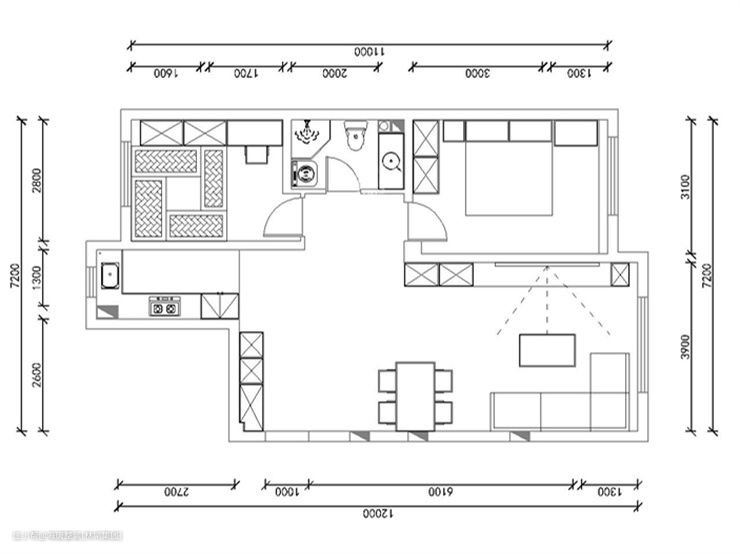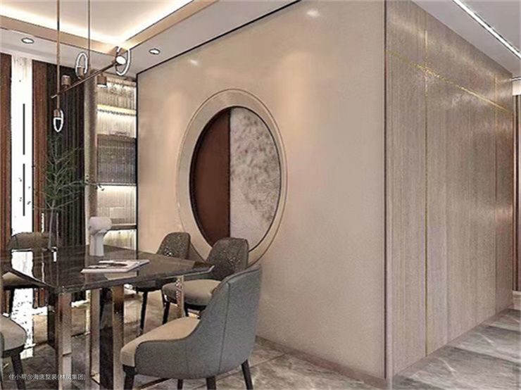 本方案餐厅位于厨房边上所以可用空间不是太大,所以我们采用顶墙方式来大大提升餐厅以及厨房过道的空间,此外在餐厅区域添加了一些新中式元素让整体风格提升了一个档次