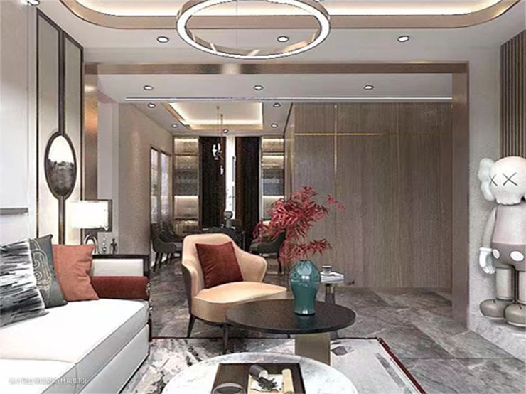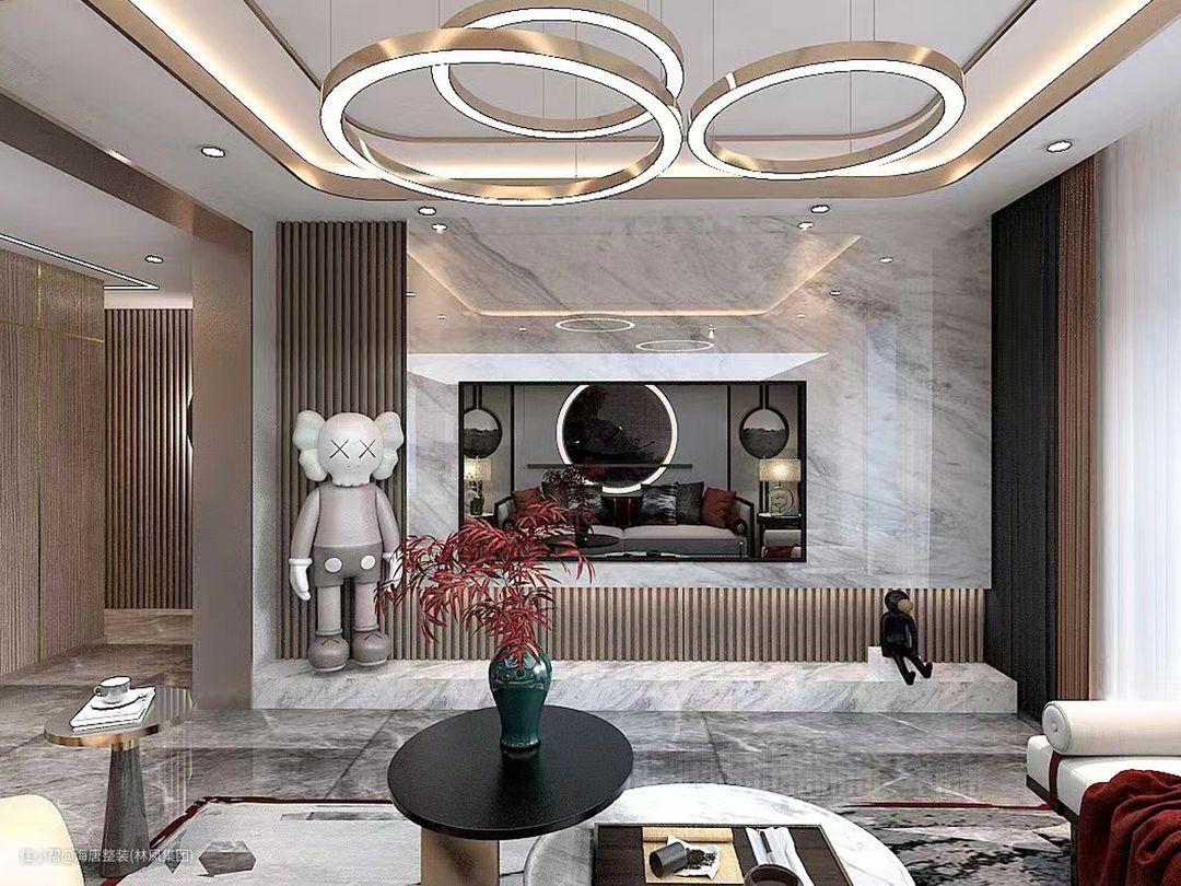 1. 本案户型客厅主要采用了金属线以及过多的护墙板搭配上理石茶几,以及一些轻奢元素的吊灯,整体颜色看起来也别舒服轻奢风格体现的淋漓尽致