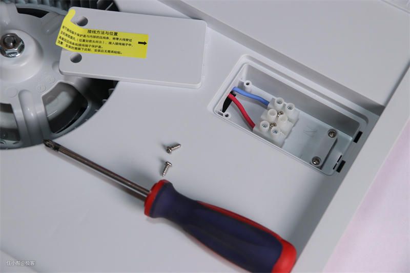 在右上角的位置设计了接线端口,打开盖板便可以看到红色(火线)和蓝色(零线),我们只需要将之前预留好的火线,零线接入即可,也就是所谓的灯线,基本上都会预留的。