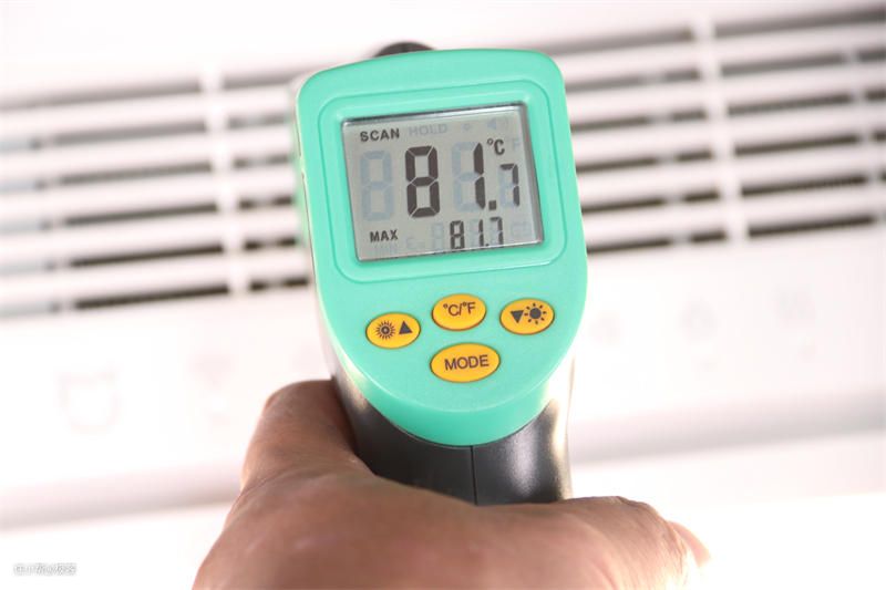 暖风低的档位时,出风口的温度达到了81℃,出风口的噪音值为65dB。噪音值是在出风口处测试的,数值有点高,但是远离出风口的话,模拟人身高的位置的话,噪音值明显降低,可在45dB左右。制热方面,效率还是很快的,一般洗浴的空间也就在5平方左右,这样的制热效率可以达到即开即热的效果。