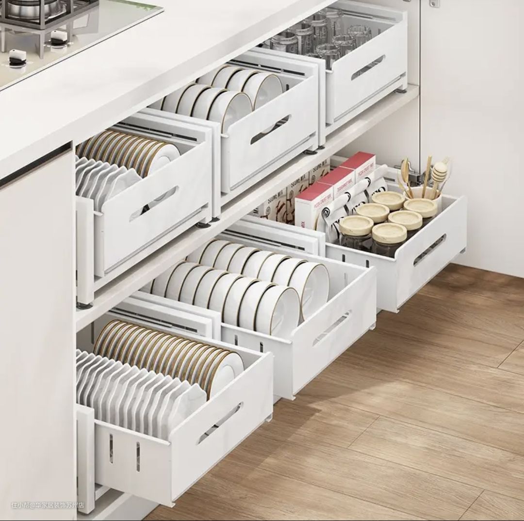 针对厨房橱柜开放格,直接选择抽拉式碗盘收纳架,根据自己的需求摆放,不占地分,还能有效分区储物;