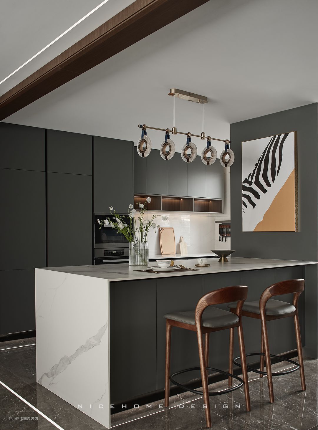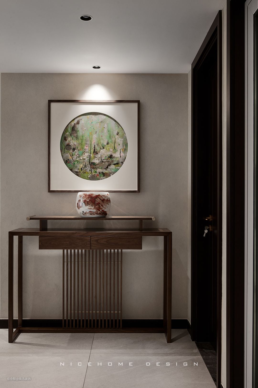 第三种情况,一侧有深色木饰面或者绿植,或者吊灯、壁灯等装饰;另一侧可以用装饰画平衡视觉,装饰画的高度可以在参照物上沿到顶面距离的0.618-0.8之间。