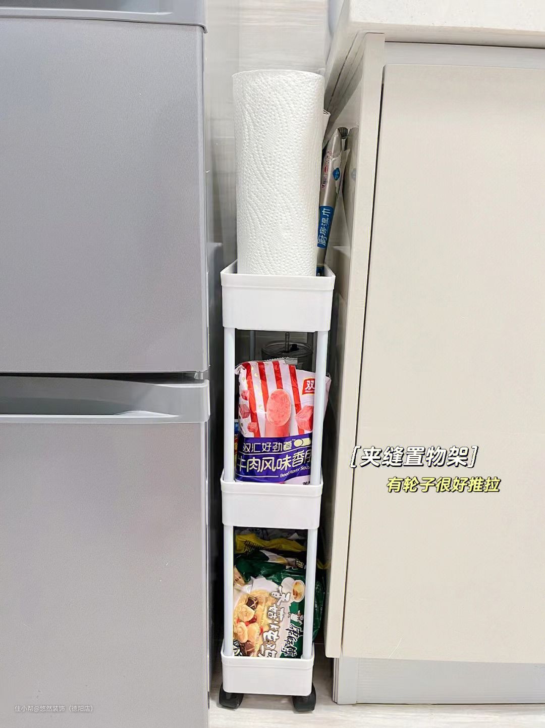 最左侧留出空间放置冰箱,对于小户型来说,冰箱放在厨房可以更好的节省客餐厅空间。柜子和冰箱的夹缝处再放置一个可推拉的置物架,把空间利用到极致!