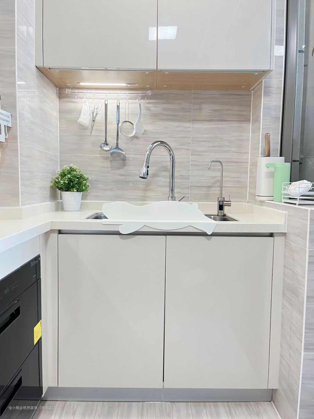 厨房宽1.63m,长3.25m,呈一字型,为遵循洗切炒盛的动线,并且增加收纳,我们把右侧设计为洗菜区,再上下方都做了收纳柜,可以储藏米面等,这样整体形成了一个L型厨房。