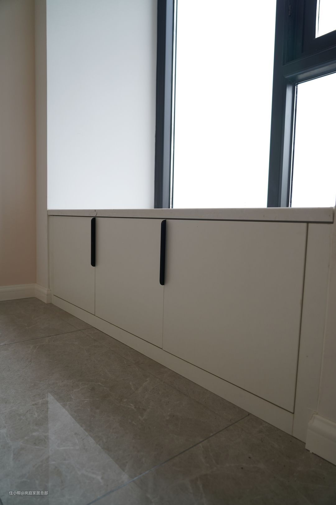 这个飘窗的底部被打造成了收纳柜,可以增加室内收纳,适合将不常用的东西放置在里面。衣柜的把手简洁大气,布置在纯白简约的饰面上,不会增加累赘感,还带有时尚气息呢。