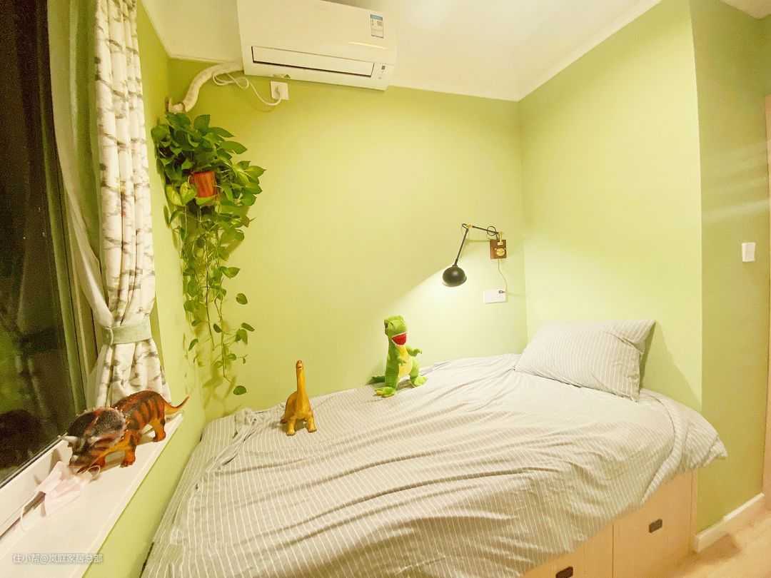 床上还摆放了一些恐龙玩具,增加童趣的同时,也让空间显得更想是一片“小森林”了。在墙面上安装了挂灯,起夜的时候开灯会很方便,且靠在床上看书也有了充足光线,提高了生活品质。