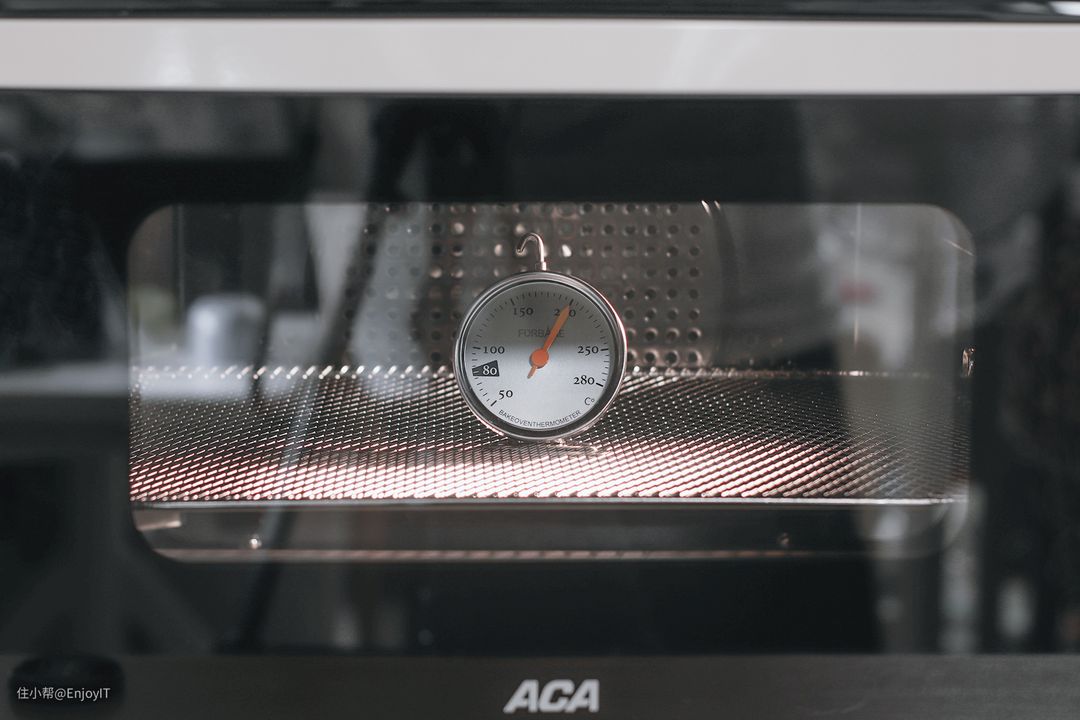 相信有经验的朋友入手烤箱也都会先空烧10~20分钟,来去除烤箱的一些机械味道,我也不例外,检查到手的外观没问题后,就通电,设为200度,空烧了20分钟,为了测试这台烤箱的内置的双NTC感温探头的控温能力,我正好借助空烧的时机,把烤箱专用温度计放在正中区域测试,在经过了约10分钟后,温度计显示烤箱中心温度稳定在了200~201之间。这个精准程度,还是我第一次见到。它可以让我们更放心的拿捏食材的火候。其广域控温也带来了更多烹调可能性,最低可至30℃的低温区还有利于面食发酵。