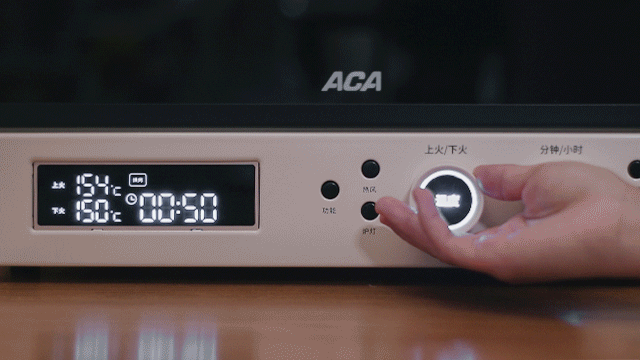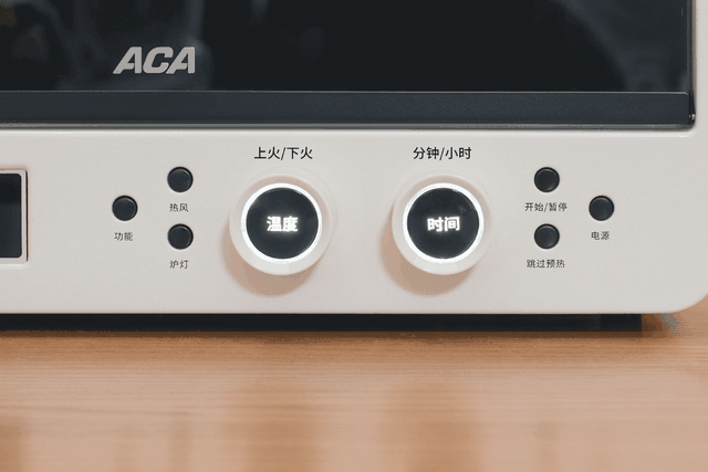 在我用过的几台烤箱和多功能一体机里,这台ACA风炉烤箱A8的操作显示区域设计可以排在前列,并未因为功能多,就安排一堆密密麻麻的平铺按键这样粗暴的呈现。左侧的大尺寸LED屏幕可以很直观的显示上下加热温度,预设模式以及所需时间。