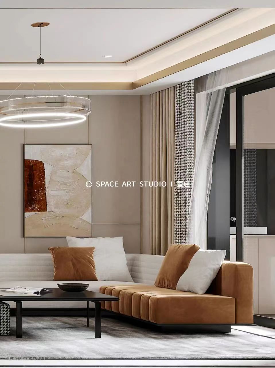 客厅背景墙以简洁为主,搭配米白色沙发,暖棕色的加入更显温馨。还有轻奢感的小茶几轻奢的优雅高端扑面而来。
