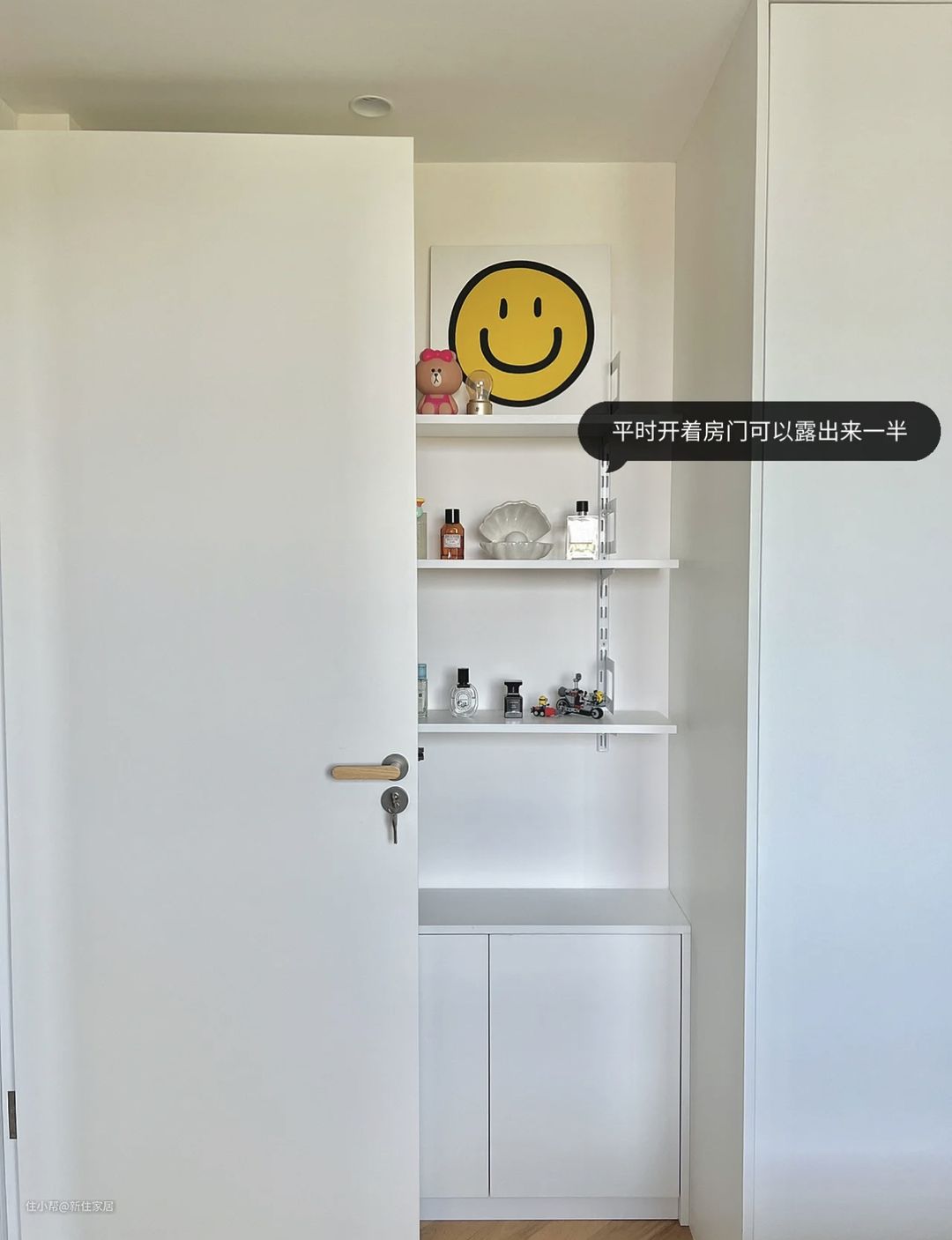 因为得留出空间开门空间,柜子就不能做整面墙,还无疑是对原本不大的卧室收纳空间,进行了二次削弱。