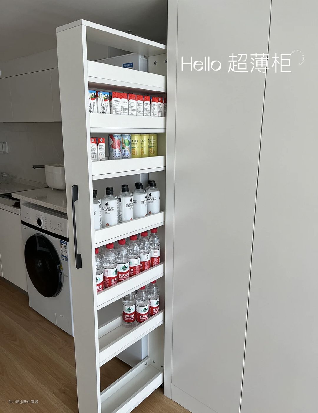 一提到薄柜,我们第一反应就是在烟道这种既占地方、还得花钱遮挡的地方,增加一组薄柜,提高它的实用价值。