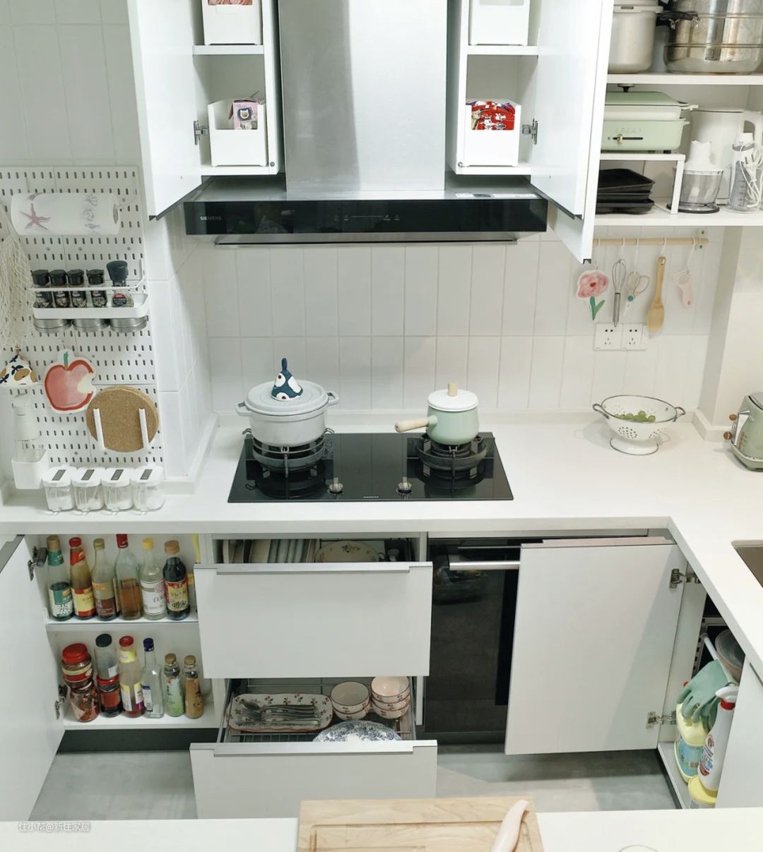 如上图,在烟道管壁上贴几块洞洞板,用来收纳厨房小工具、调料盒等,就在灶台旁,用起来也顺手。