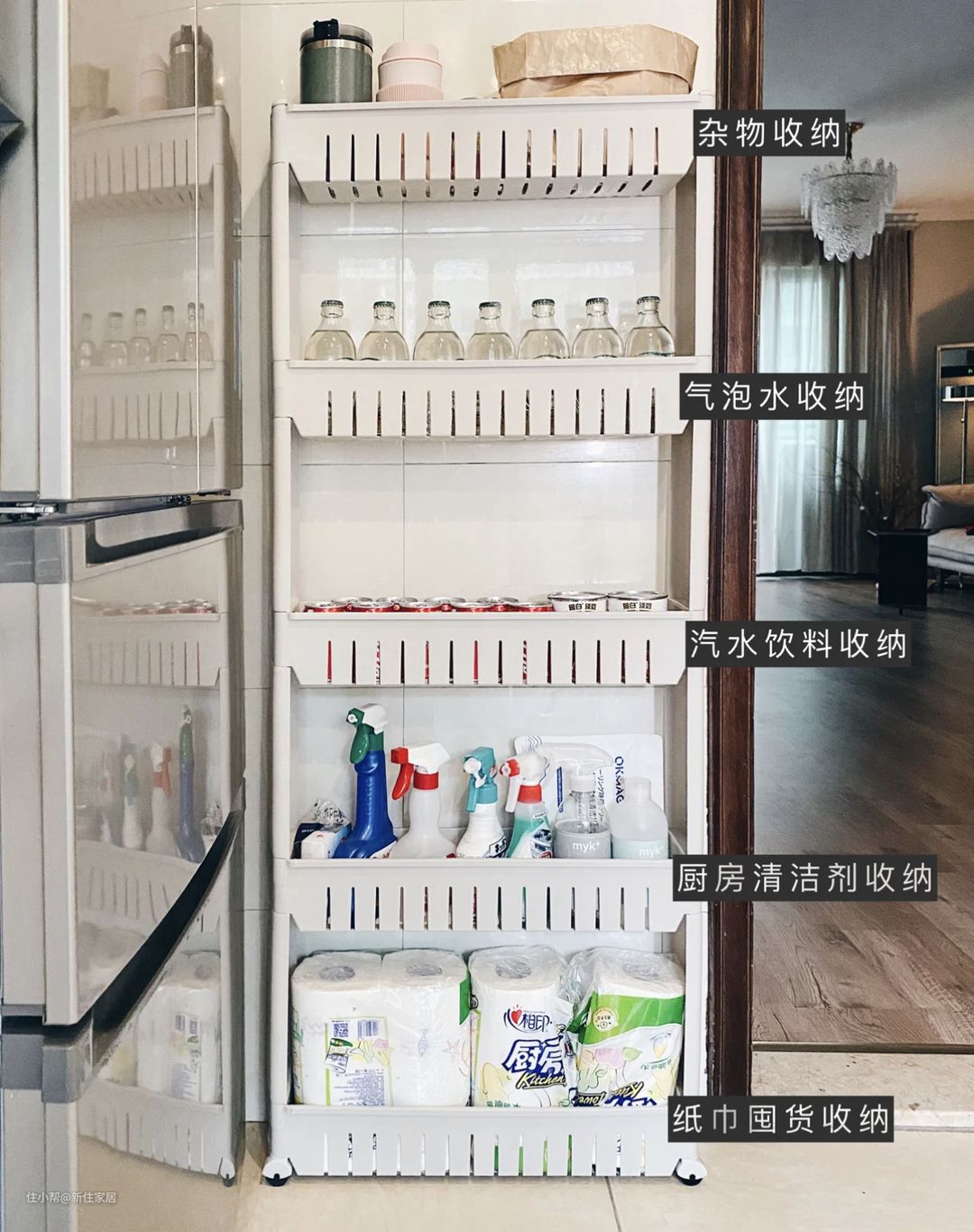 便宜点的是塑料的窄缝收纳柜,与上图窄柜同理,底下同样带轮子,推拉进出,拿取方便,就是高低、材质不一样。