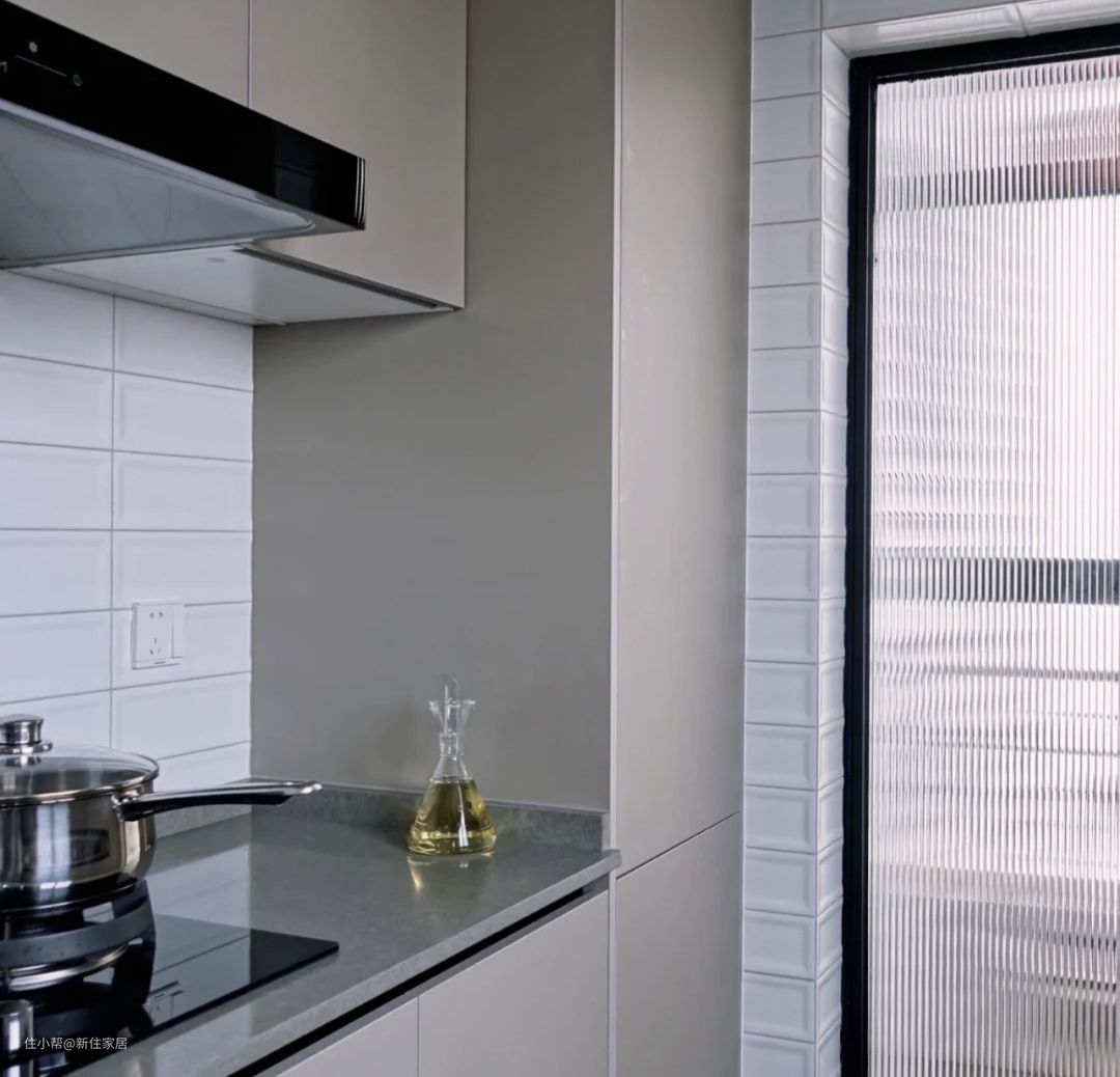 而且,烟道一般都在灶台旁,此处放置调料,做饭拿取方便,且释放了台面一定的空间,也免去了调料瓶粘油烟,产生黏腻感的困扰。
