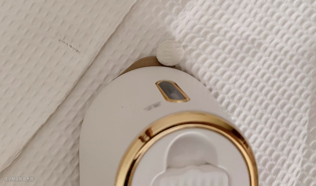 这款电熨斗共有灰藕紫、豆荚绿、奶糖白、小鸡黄4个颜色,我买的是白色。电熨斗把手是按压式的,按钮表面是一层金色的“年轮纹”,按压上有摩擦力,防滑。按住按钮你能使把手旋转90°或者180°,我平常使用是旋转180°,让它与机身在一条水平线上,这样使用起来比较方便。