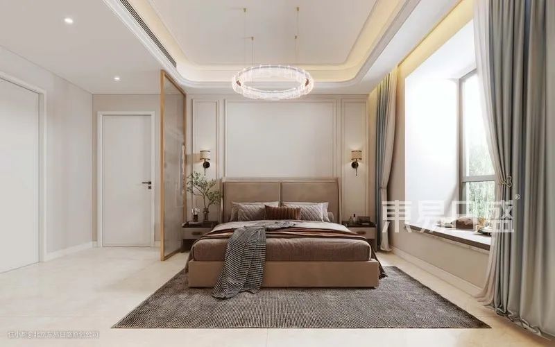 主卧采用了暖色调,给人安心的感觉,吊顶主灯设计使得天花视觉更加简洁大方,柔和的灯光使得整个空间舒适安逸适合休息。