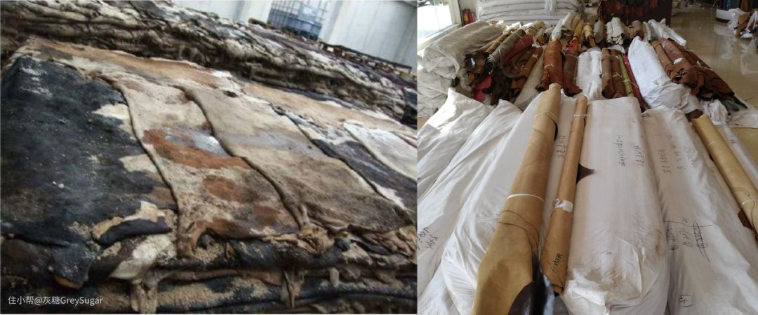 而这种原料皮和印染好的皮完全是两个东西,很多牌子却用前一种混淆后一种。不信你看,两种产品的区别有多大。
