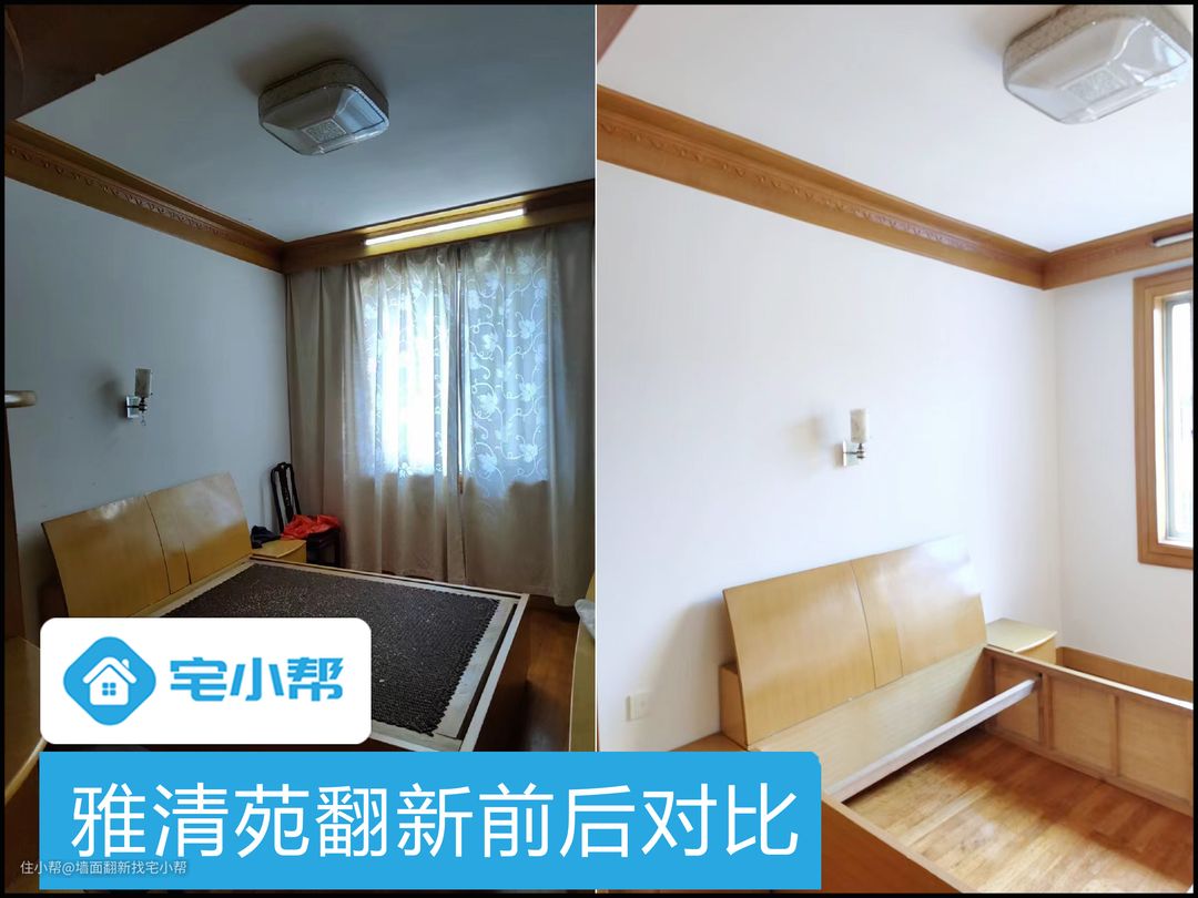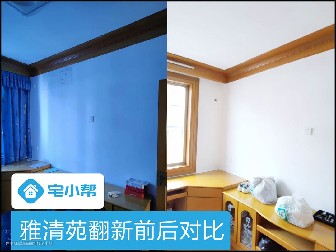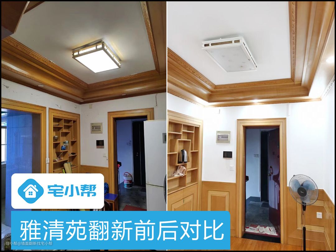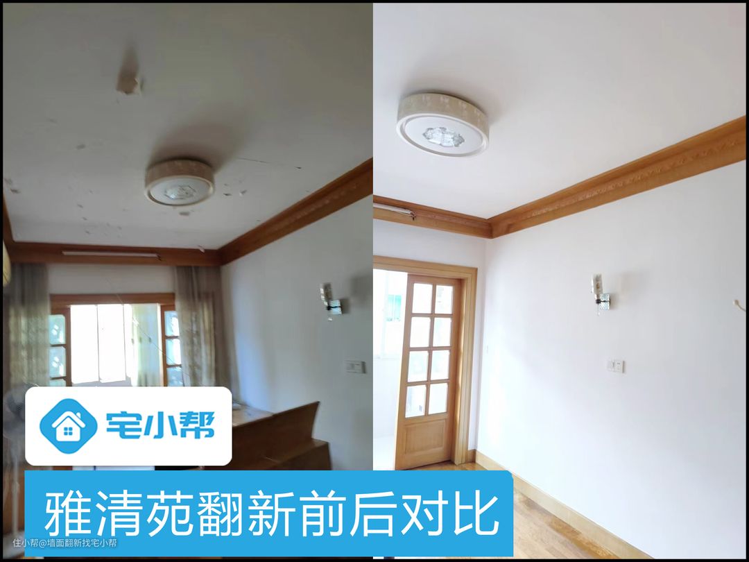 雅清苑业主的这套房子怎么看在当时都算“豪装”了,木本色的木作装修和实木地板放到现在看也还是很高端。就是墙面变得昏暗了,同时部分顶部和墙面出现了空鼓起皮掉落的显现,于是找到宅小帮决定翻新一下墙面。我们先看看翻新前后的对比吧。