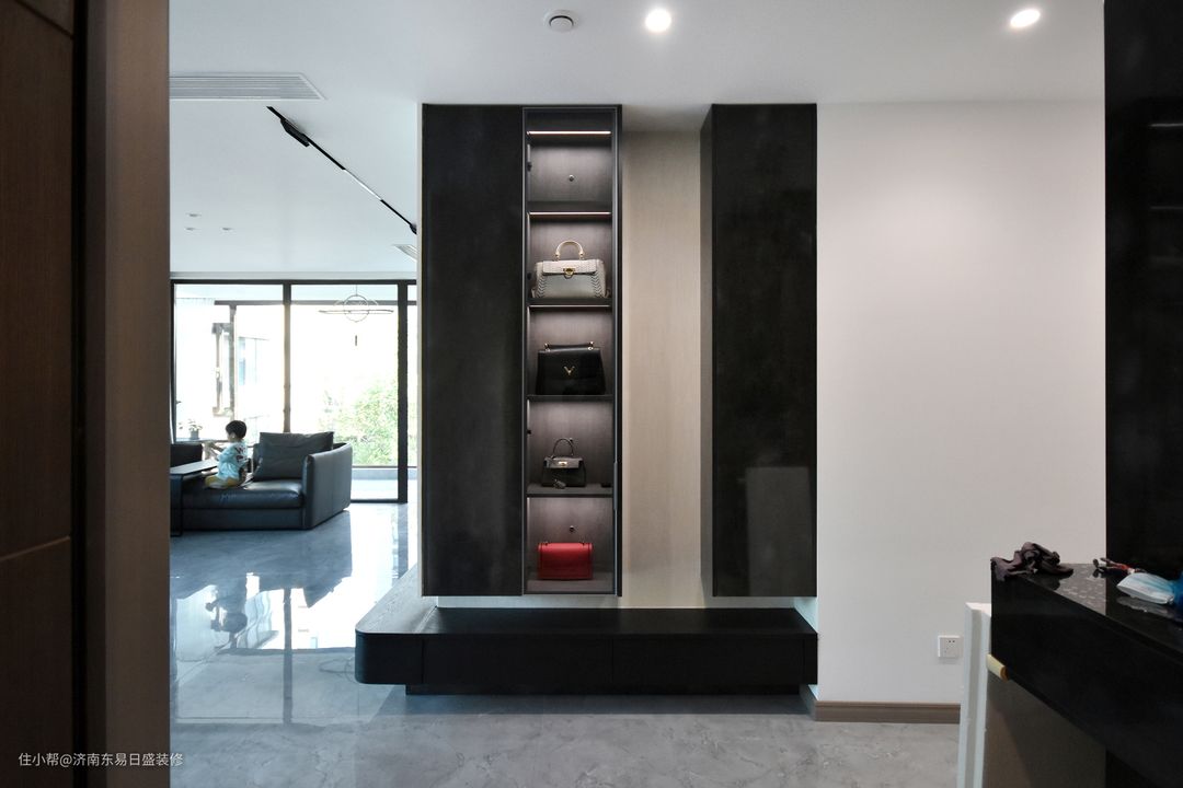 玄关是作为休息和出发的交汇点,设计尽量方便和舒适。之前一进门看到的是一面白墙,简单无趣看久了还有些压抑,设计师把旁边的电视背景墙做了一个延伸形成3个储物柜,其中镂空设计里预埋灯带放置女主人的包包,不仅增加了储物功能,对于整体的装修风格也相互呼应。