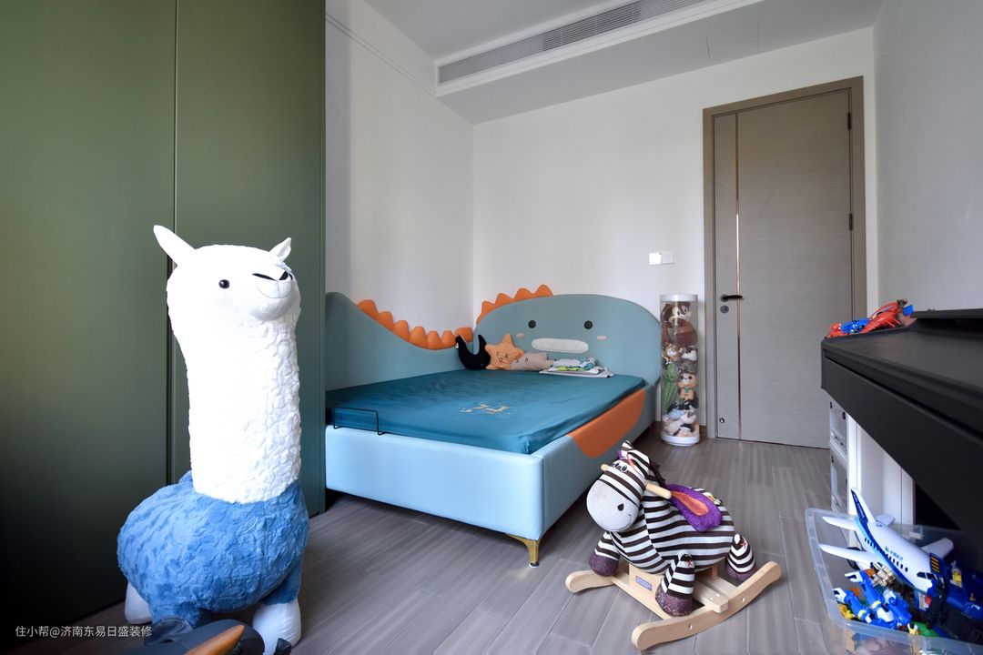 最后一个房间是给主业的小儿子所设计,整个房间的颜色相对于其他卧室就比较鲜明,绿色的衣柜和同色系的窗帘相辅相成,儿童床设计成蓝色恐龙模样,靠墙的两边都用卡通防撞墙海绵贴进行包裹,对孩子的安全进行一个防护。房间里还收纳了孩子的玩具以及一架儿童钢琴,玩耍与学习两不耽误。