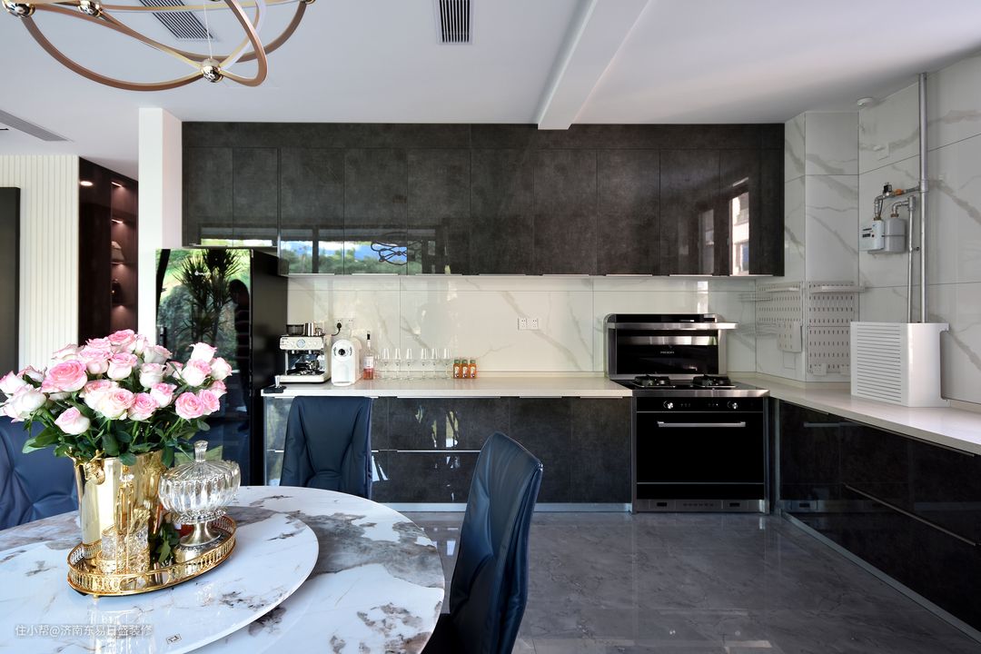 厨房、餐厅与客厅做的是开放连通式设计,厨房的柜子采用亮面灰黑色柜门,不仅显得空间高级外还适合放在油烟较多的地方易清洁,下面是嵌入式冰箱和L型台面,实现洗切炒放流程化做饭,从此避免手忙脚乱的场景。