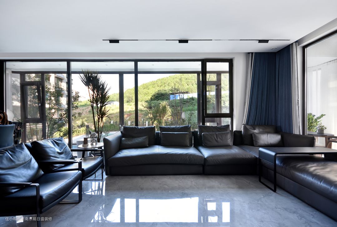 设计师为了满足业主的需求,客厅和餐厅的色调以黑白灰为主,加入极简设计如极窄窗套和线型灯等。客厅以灰色亮面大理石瓷砖通铺,深咖色皮面沙发更显丝滑,搭配贵妃椅更添舒适之感,客厅的中间没有放置茶几而是选择用边几代替,更加小巧灵活,这样客厅的中央不仅可以留出空隙供孩子玩耍,而且打扫卫生也更加方便。设计师在高级的色调基础上又为空间注入一抹优雅、高贵的蓝色窗帘,不仅提升了装修风格的格调还有遮挡光线的作用。