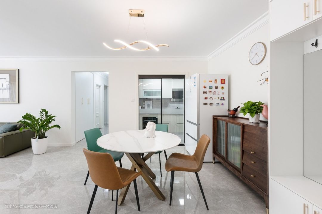 餐桌旁是胡桃木色餐边柜,流畅的线条、温润的触感、细腻的纹理、天然实木香,实木家具拥有满满的故事感,餐边柜承载家的"烟火气”,也是厨房的延伸,缓解储物压力,还是餐桌的好帮手,更细致的分区,让它可以装下更多物品,将餐厅琐碎物品整理的井井有条,好看又实用,带来满满的幸福感。