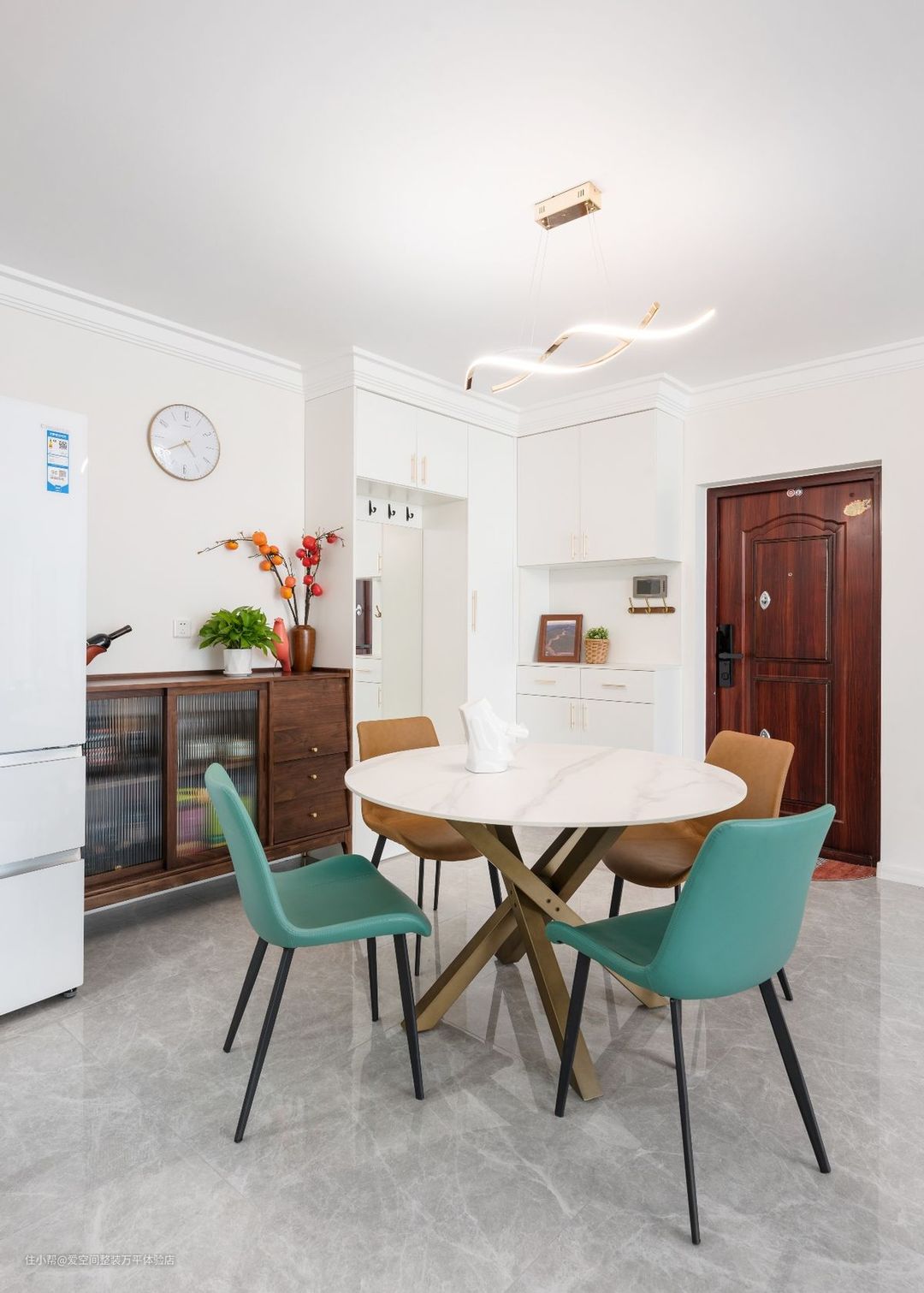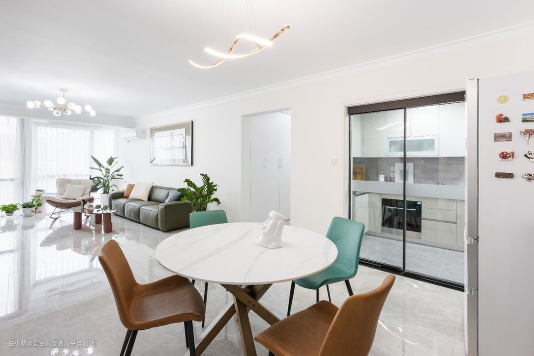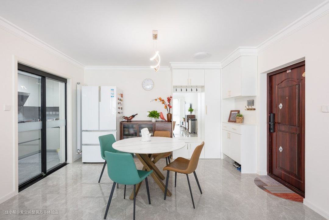 从大门一进来就是餐厅,餐桌正对着大门,另一边是厨房玻璃推拉门,厨房门使用玻璃的,显得整体空间更为通透,厨房到餐桌是一个直线距离,更方便上菜了。