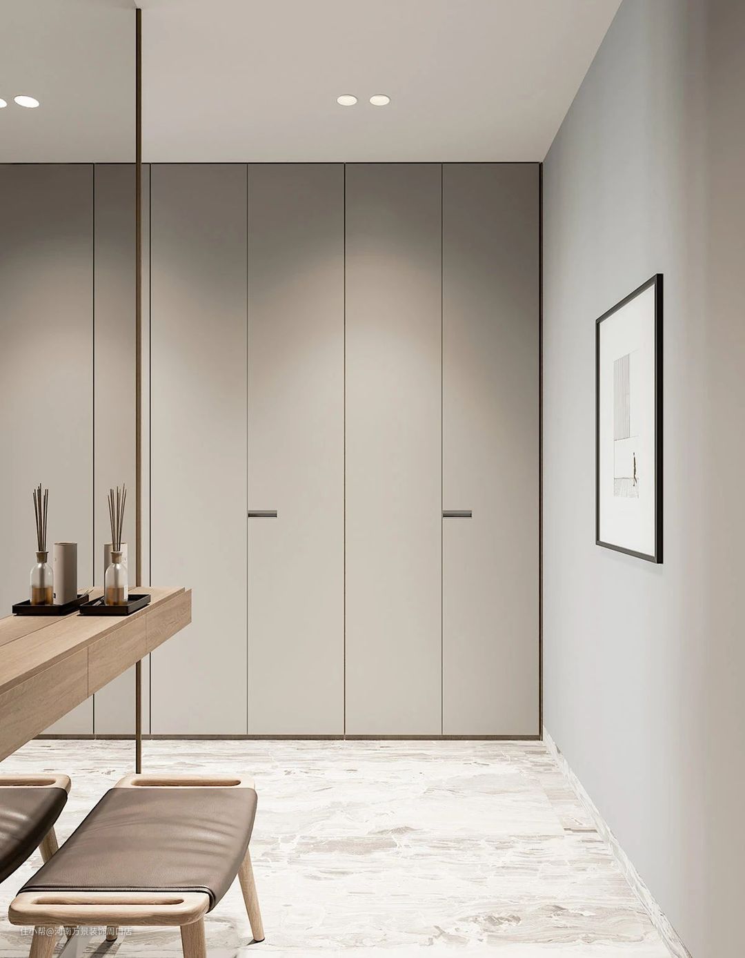1、入墙式衣柜,把墙体拆除一部分打造成柜子,不但能增强空间的使用面积,还能有效地扩大生活空间,整体环境达到和谐统一,既美观又实用。