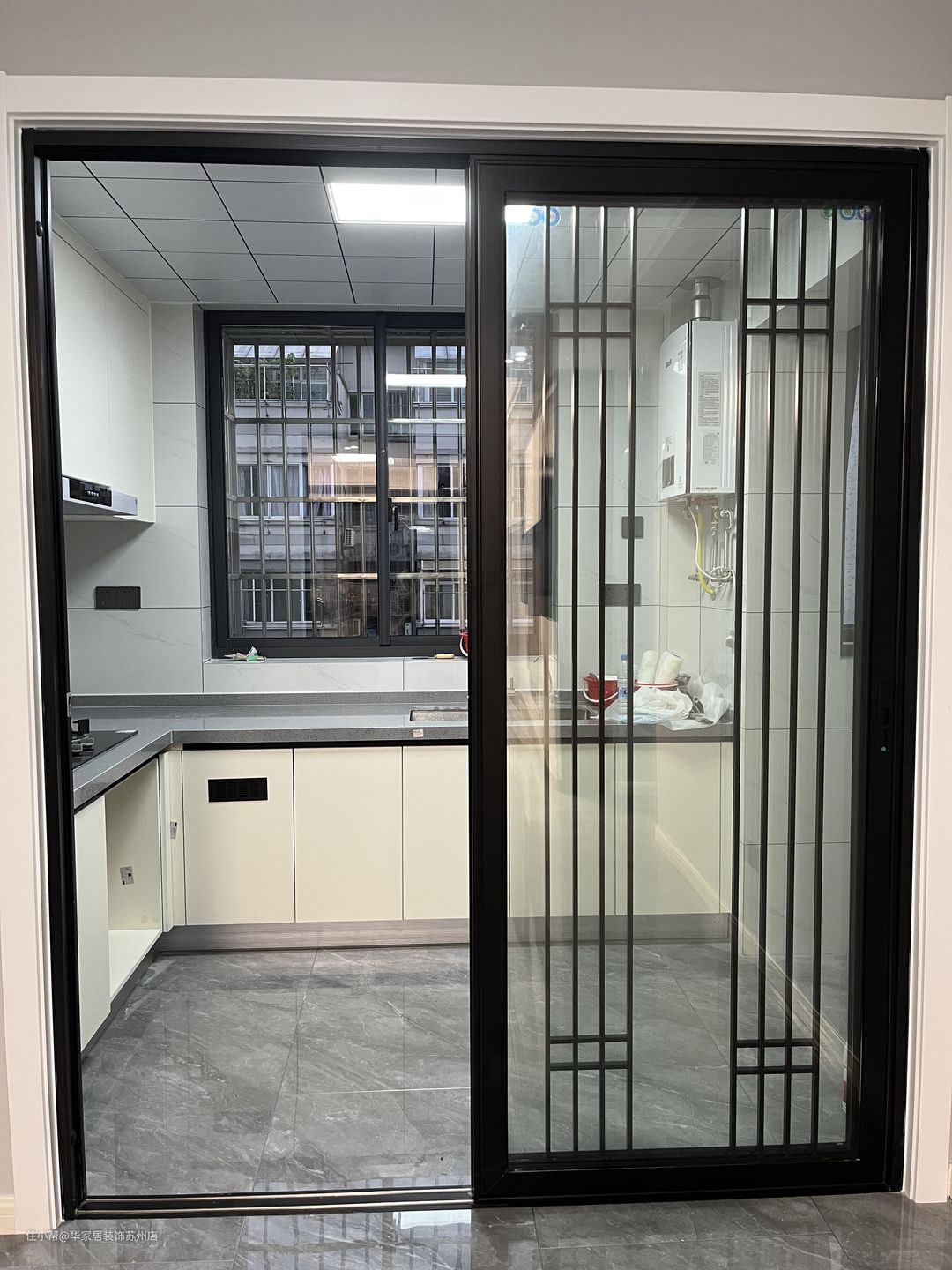 选择玻璃移门,黑框包边更有现代感,玻璃门的设计,不会影响到客餐厅的采光,而且加上移门,还能防止油烟的散出,简直是太实用了~