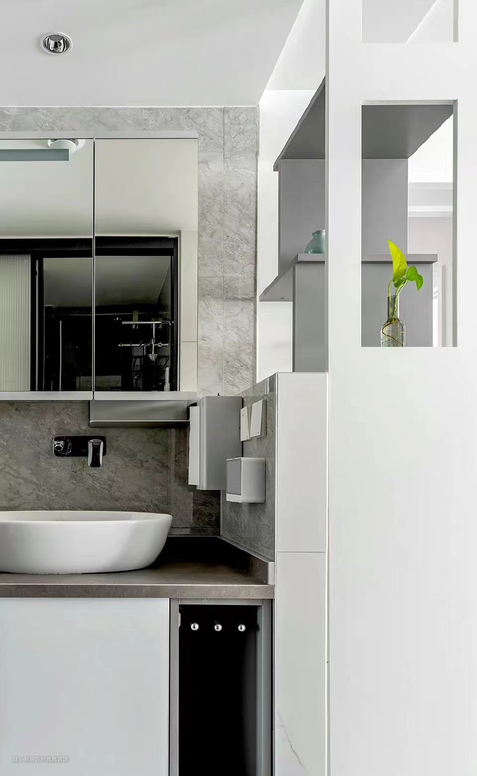 卫生间选用台上盆+墙排的龙头的形式,壁挂的地柜内含储物,和储放脏衣篮的空间。用不同的收纳,满足不同的功能需求,让空间结构更加合理化。