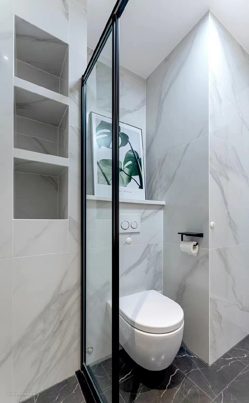 独立的淋浴房墙面预留了三个内凹的壁龛,一体式的瓷砖通铺。不仅方便日常打理,整体也更加统一。
