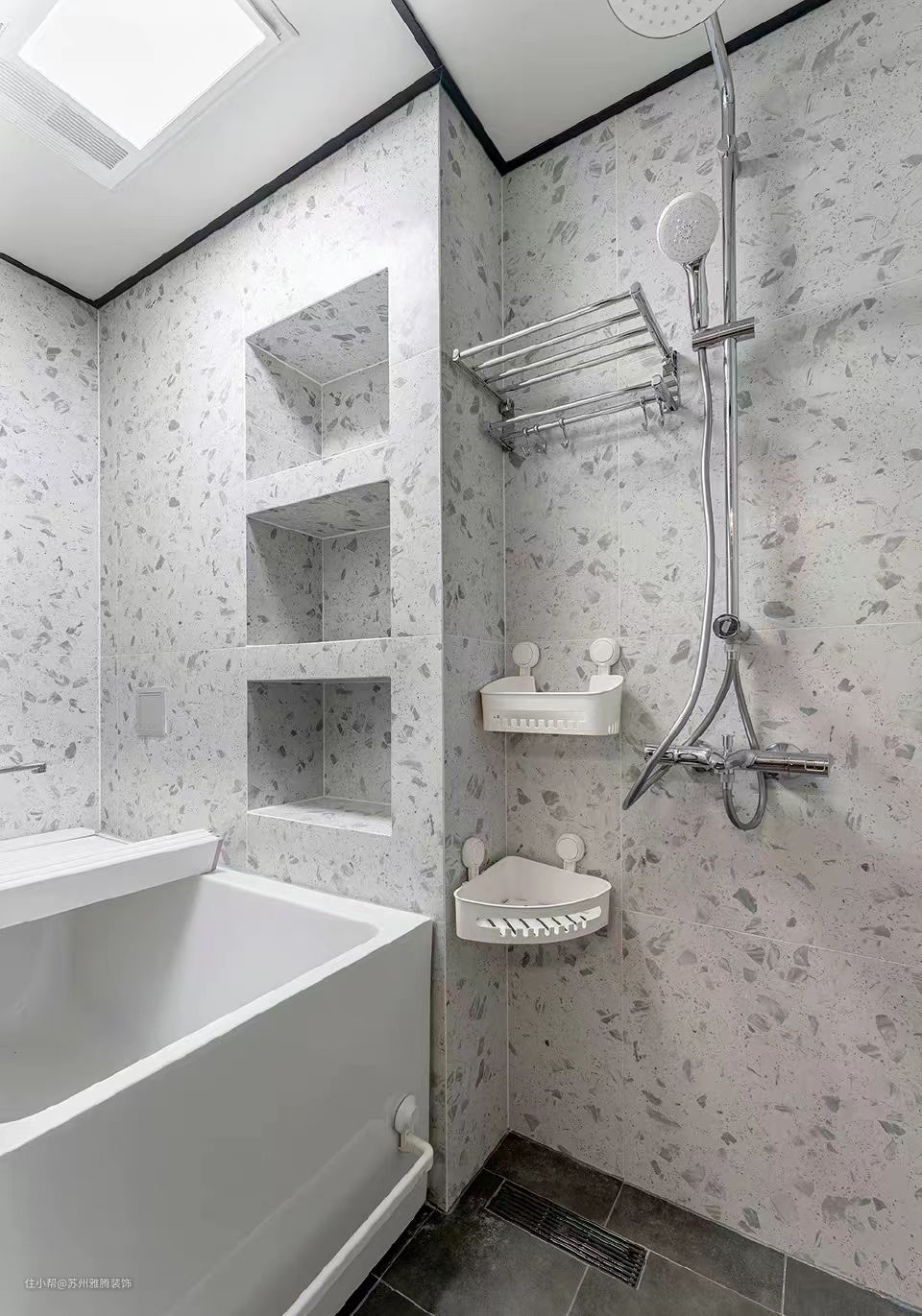 卫浴空间分为两个部分,内侧嵌入亚克力浴缸,满足泡澡功能并利用管道延伸只做壁龛。外侧是淋浴,利用墙面置物架,让物品上墙节省空间。