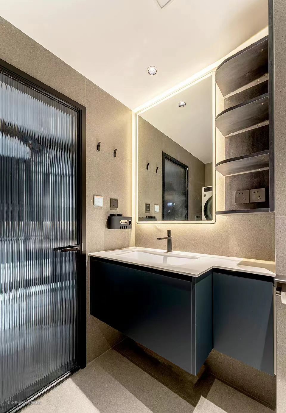 浴室柜的设计,右侧定制切角与管道齐平,提高空间利用率。上面用智能镜+开放格的设计,提升收纳的多样性。弧形圆角设计,增加柔和感更安全。