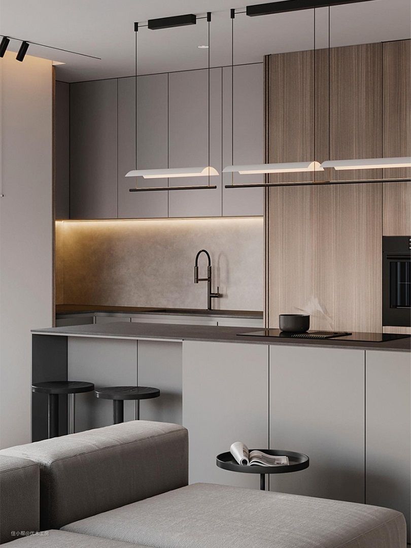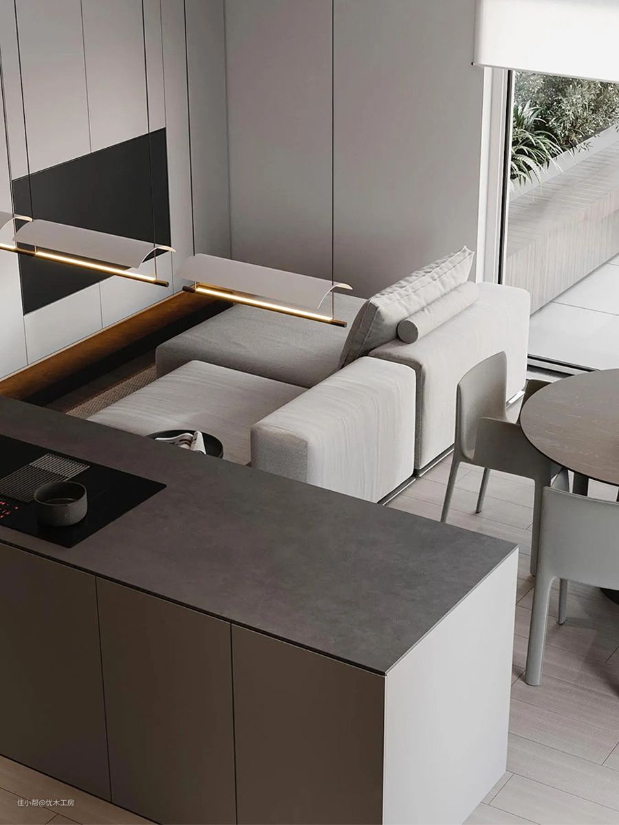 操作台区域安装滑动门得到有效隐藏,保持客厅的美观完整性;同时在岛台设计了简易互动吧台,增加其功能性。