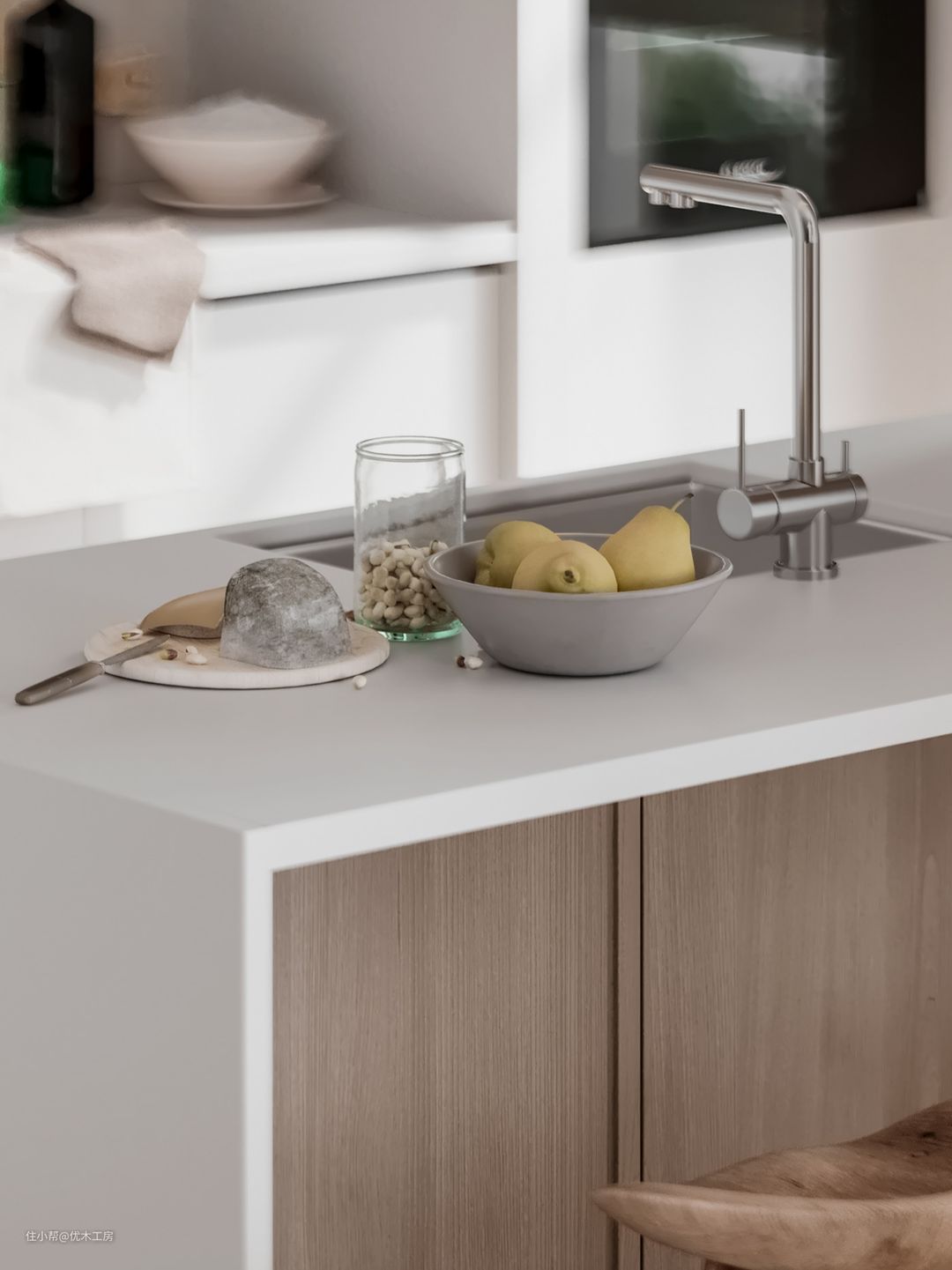 爱格W1000搭配爱格H1377浅木纹,木纹材质与生俱来的肌理感,独特浅色调极富魅力,搭配明亮纯净的至尊白,打造简约爽朗的空间,烹饪与用餐兼得,让一日三餐都变得更加自然舒适。