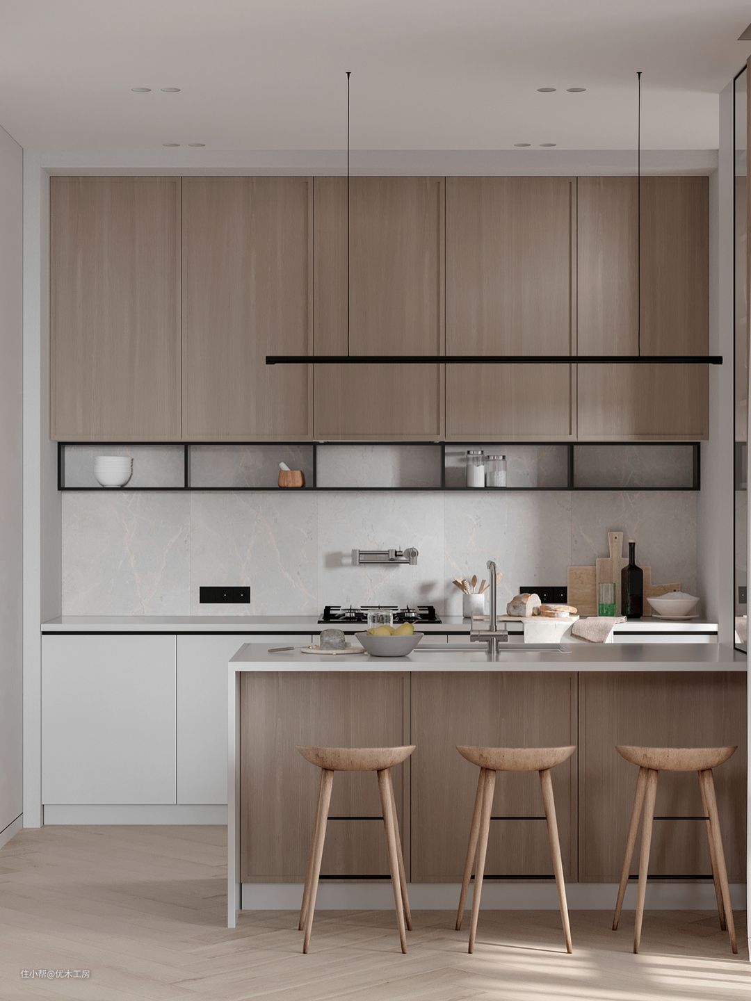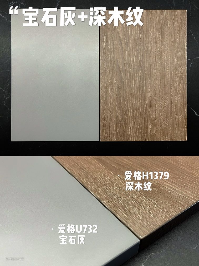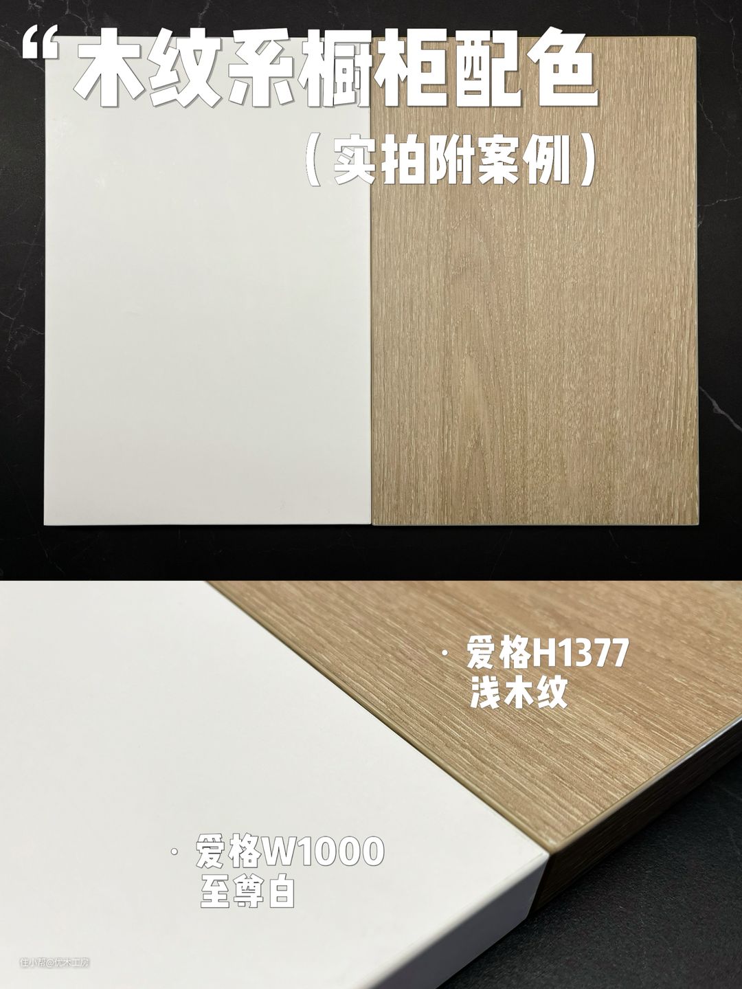 今日分享两组热门的木纹系撞色橱柜,「至尊白+浅木纹」与「高级灰+深木纹」,原相机拍摄板材并附案例,记得收藏备用哦!