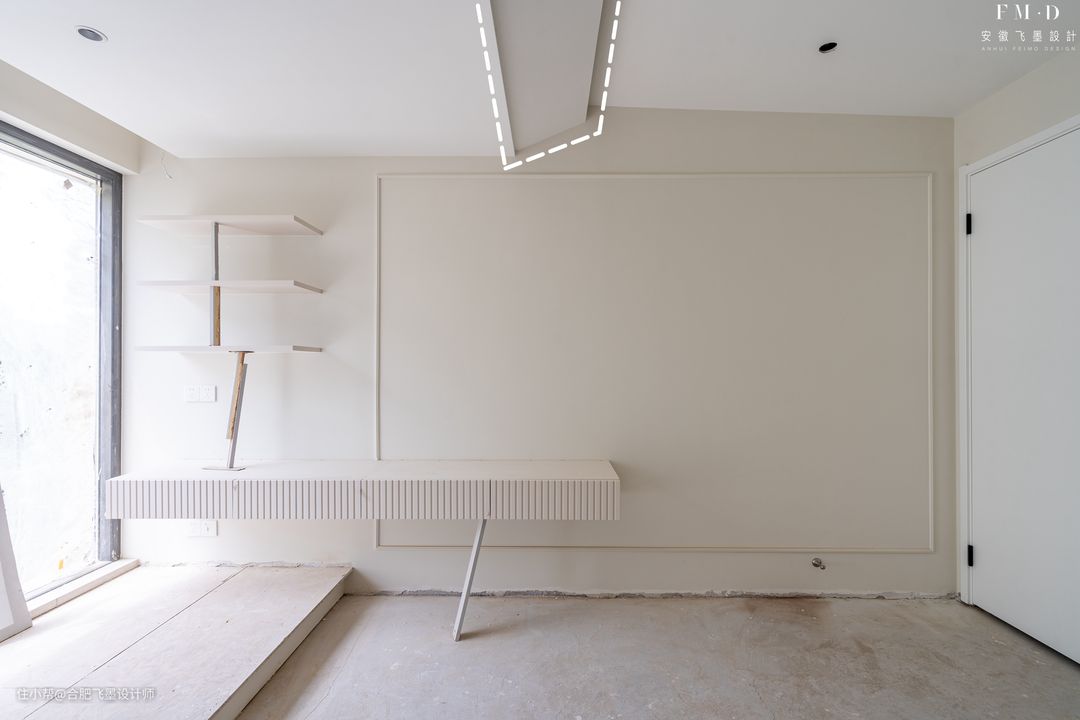 像是下面这家,合并阳台后,留下的横梁过低,动不得的情况下,灵机一动将横梁边沿延伸成S弧的造型,柔和的线条不仅瞬间弱化了横梁的存在感,高度差也没那么明显了。