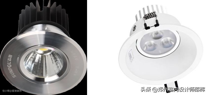 在传统光源时代,射灯一般就是做个空腔,再放个射灯灯泡进去就好了,而LED时代的射灯基本都做成一体的。在下图中,射灯的开孔尺寸一般是55mm或75mm,再嵌入到天花板,用的就是LED光源。