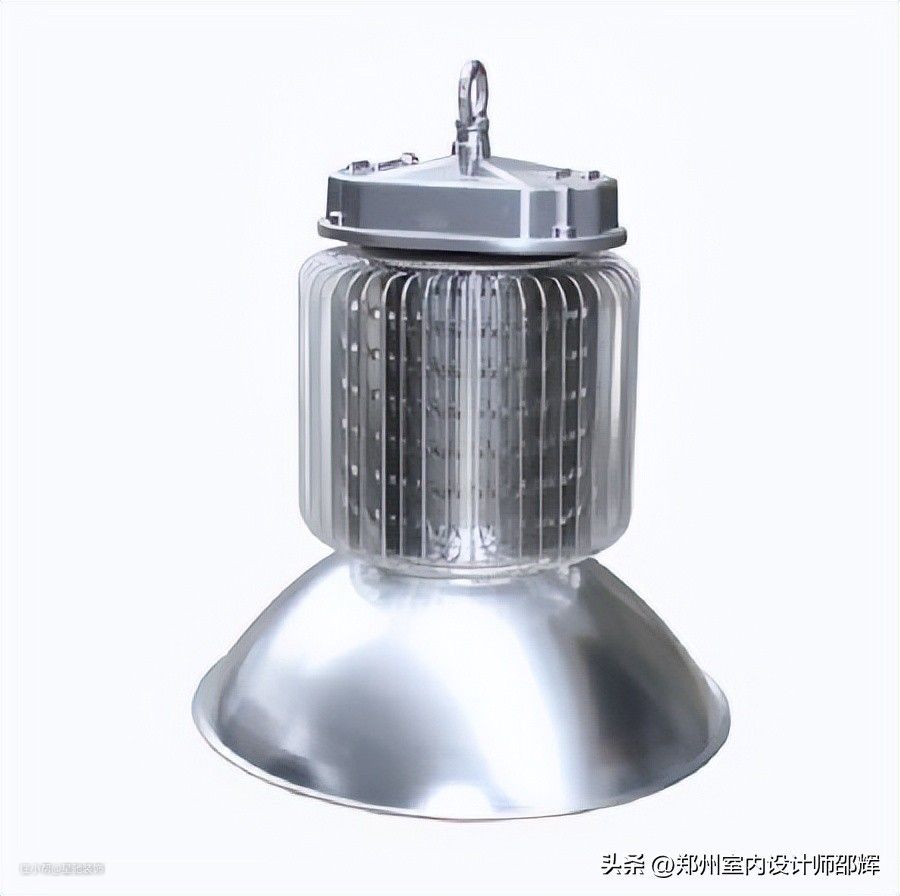 工矿里用得最多的灯,是高天井灯、高天棚灯,或者叫工矿灯。如果默认说工矿灯,外观基本跟下图差不多:一个圆圆的斗笠里放了个光源,后面是电器,把它吊起来,就可以照亮很大一片的空间。
