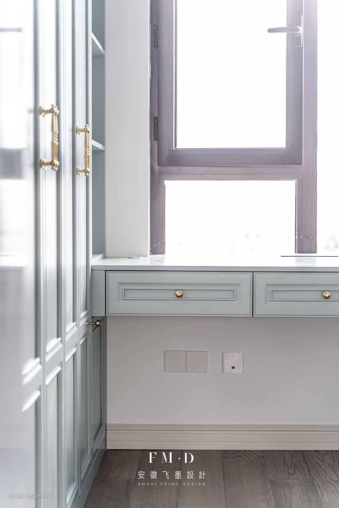 这里需要注意的是,为了保证书桌两边的柜门能正常开关,和书桌连接的柜门可以做成三段式,或者直接开放格,作为书桌的扩展储物。