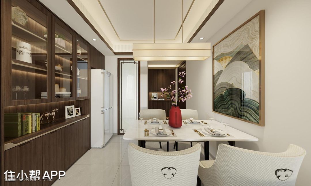 贴墙定制整面胡桃木餐边柜稳重大气,白色抹布餐椅搭配岩板餐桌简约清爽,平衡餐厅配色。