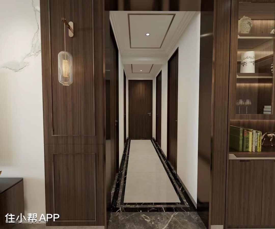 新中式装修的走廊特别适合做波导线,搭配长方形石膏线天花吊顶呈现对称美。