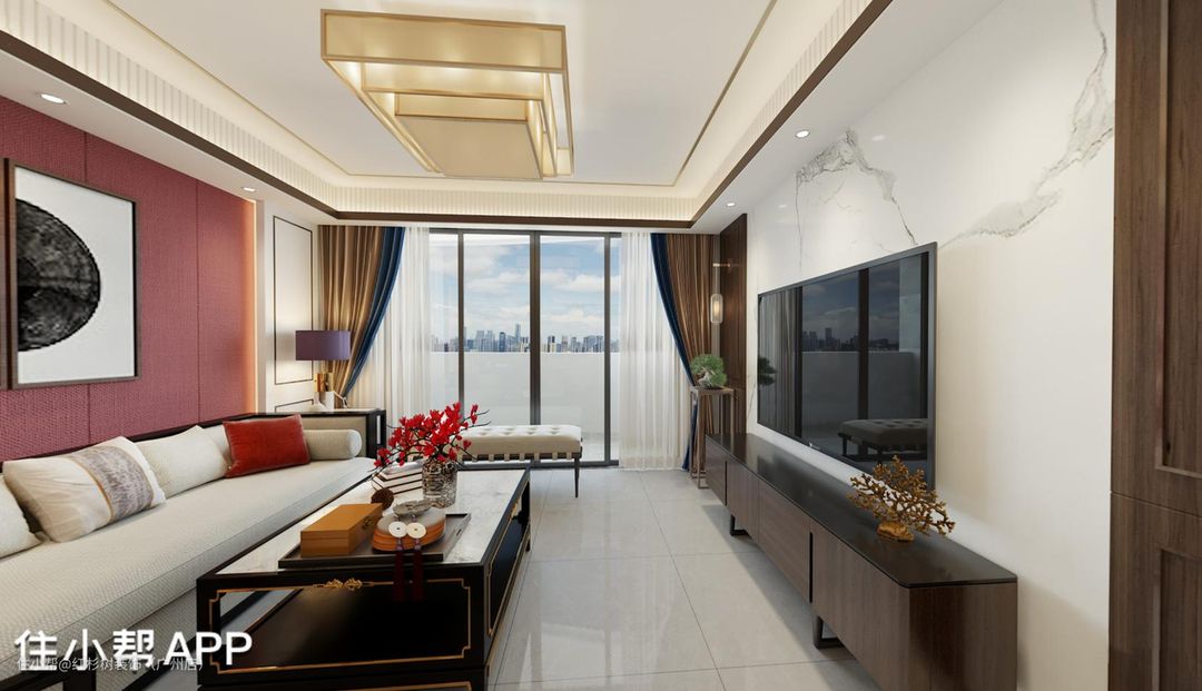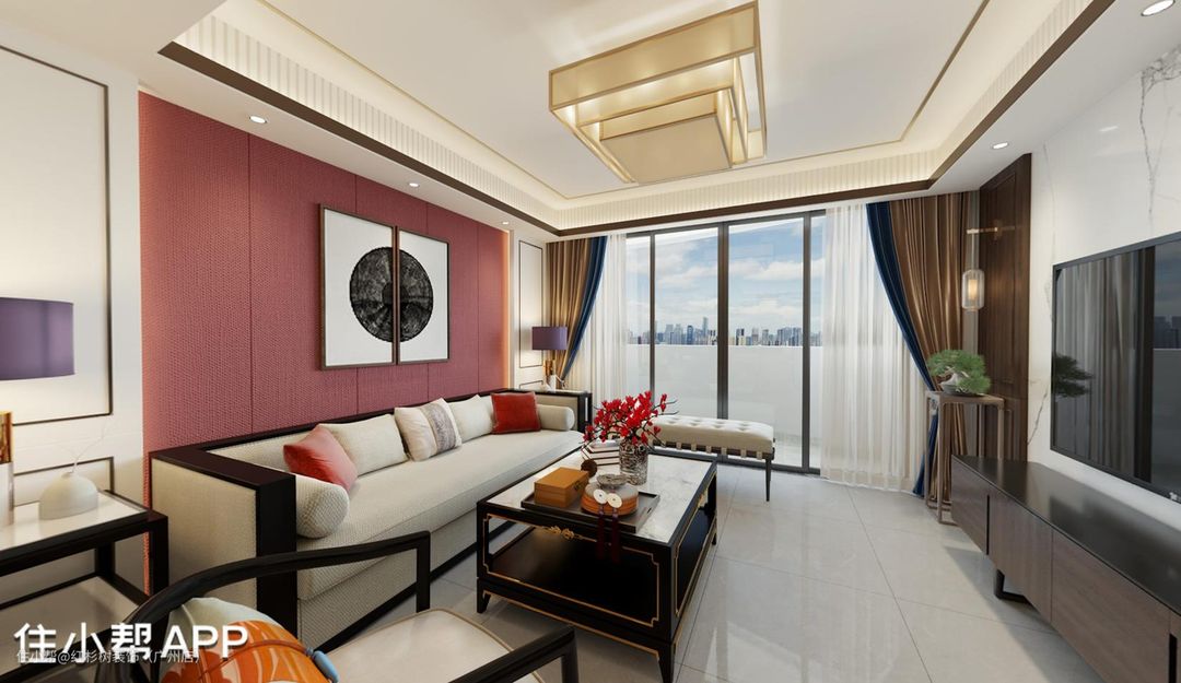 朱砂红背景墙令人眼前一亮,经典黑白搭配沙发茶几组合,木制与布料之间碰撞出新中式之美。大回型天花吊顶搭配金属框线精致夺目,意式岩板背景墙又透露出几分轻奢气质~