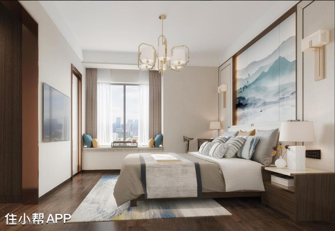 主卧通铺木地板,软装偏素雅,背景墙对仗工整,山水画和素色地毯相呼应,两侧灯具对仗工整。