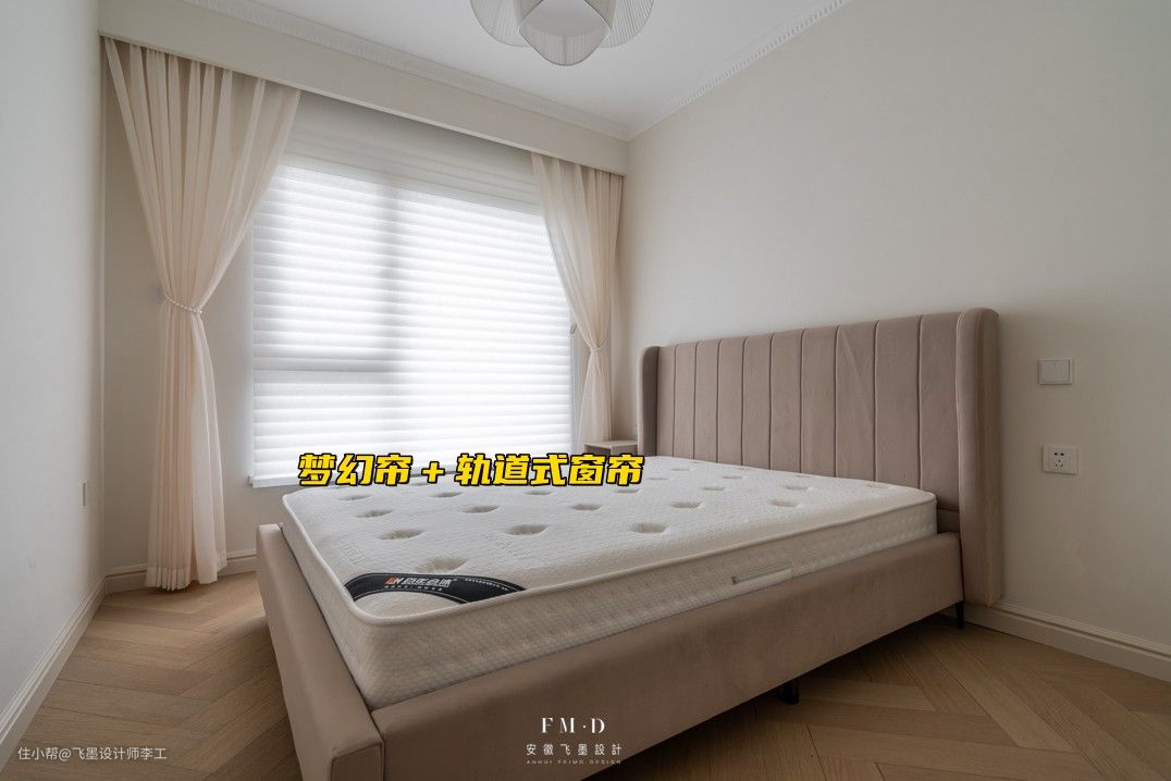 ②两层窗帘都在飘窗位置安装,设计窗帘轨道时一起安排上,不需要另外预留窗帘盒、轨道。飘窗的空间在卧室,显得更宽敞。