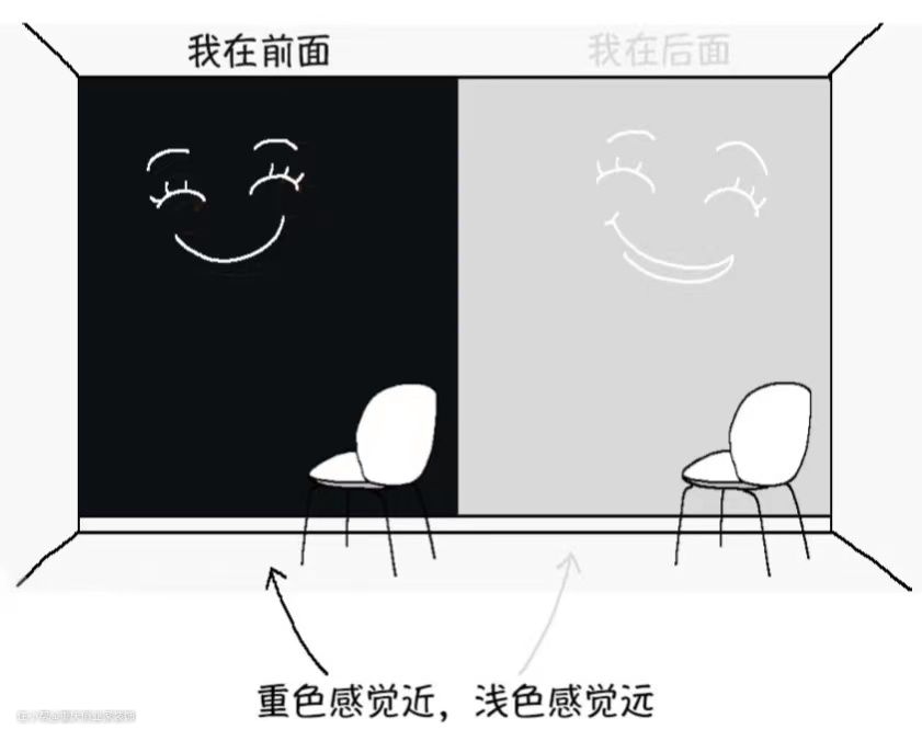 人的视觉会跟着线条走,横向或者竖向就可以表现出宽或高的视觉效果;而颜色的深浅也可以表现出空间的前后感。
