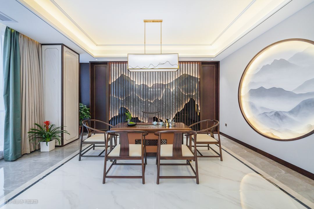 在新中式里面也可以很随心的做一些装饰,譬如茶室、餐厅,布置一些合适的绿植、装饰,很能增添意境,而又不会影响整体的 格调,“移步换景”的情趣与效果在新中式的家装里面依然也可以展现的淋漓尽致。当然也别一个劲儿的去展现装饰,家具等软装的搭配以及颜色选择也需要下心思,在设计的时候就需要考虑进去,譬如像家具一般尽量以深色为主,一些壁画、墙面多以山、水、园林来搭配装饰,整体布局下来会收获意想不到的效果与意境。