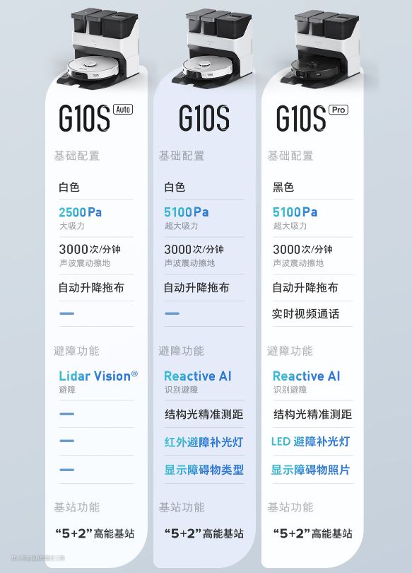 G10S AUTO:延续了G10S系列的绝大部分配置,但是去掉了结构光避障,吸力调整到了2500Pa。避障功能的减法带来了价格的降低,G10S AUTO适合追求功能全面同时对避障性能要求不高的小伙伴。